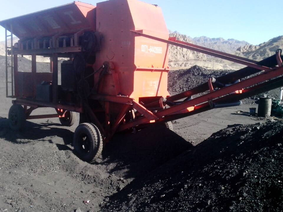 本機主要由,機架,供料倉,供料皮帶機,破碎機,輸送機,移動輪胎等六部分組成。物料經過裝載機送到供料倉,在經過供料倉下面的皮帶機傳送到破碎機里,電機經過三角帶轉動到破碎機大輪,是破碎機里的錘頭按照調整好的方向運行,利用錘頭的力量和慣性將破碎機里的物料破碎。